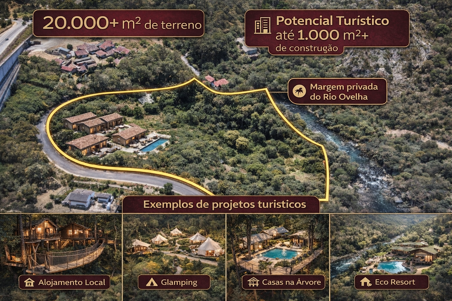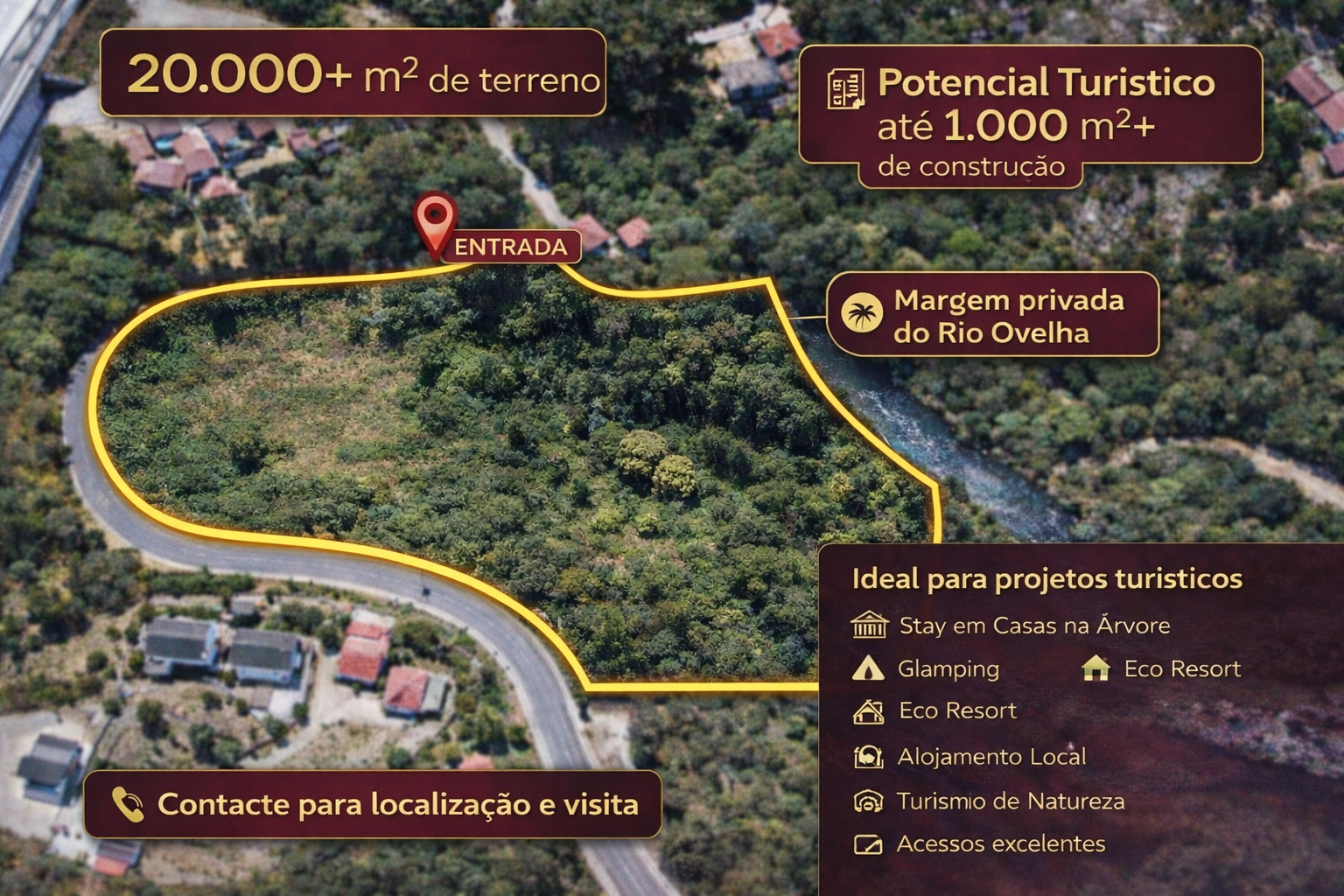 Oportunidades como esta aparecem pouco no mercado: quinta com margem privada do Rio Ovelha, numa zona com forte procura turística e vários projetos já em exploração. ?? Dados-chave que interessam ao investidor: ? Área total: +20.000 m² ? Rio Ovelha com margem privada (diferencial raro) ? Construção própria: até 300 m² ? Projeto turístico: possibilidade de +1.000 m² de construção (mediante projeto/licenciamento) ? Acessos diretos e em excelente estado ? Mais de metade do terreno plano ? ideal para implantação e desenvolvimento ?? Ideal para: Glamping | Eco Resort | Alojamento Local | Turismo Rural | Retiro natureza / bem-estar A propriedade encontra-se sem construções, permitindo começar um projeto do zero, sem limitações, com liberdade total na implantação, design e infraestruturas. ?? Contacta para localização, documentação e visita.